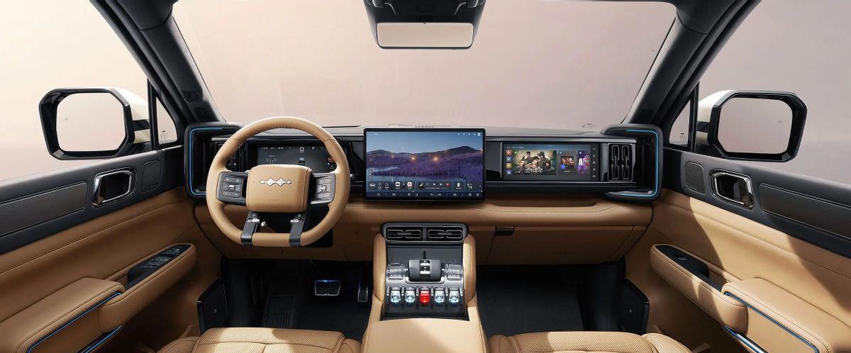 坦克300 Hi4-T采用传统布局,12.3英寸仪表+14.6英寸中控屏搭载高通8155芯片,支持HUAWEI HiCar、四区域语音控制、手机控车、车载KTV等功能,并保留部分实体按键,操作高效。Nappa真皮座椅支持主驾8点按摩与记忆迎宾功能,前排通风设计提升舒适性。标配的L2级驾驶辅助具备高德地图、遥控泊车、循迹倒车等功能,但没有提供领航辅助功能,科技感与智驾功能上略逊一筹。