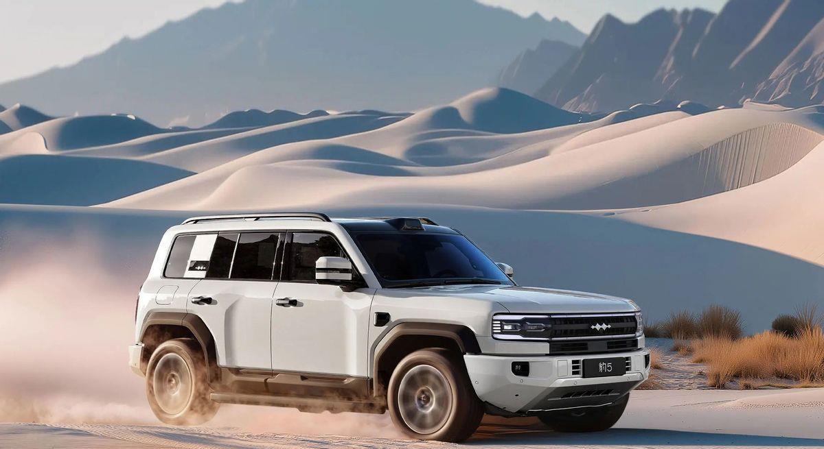 首先来看看外观打造。豹5则以科技感重塑硬派美学,矩形进气格栅与环形LED灯带构成前脸视觉焦点,矩阵式大灯、熏黑轮眉与侧裙强化肌肉感。车尾配备外挂备胎和电吸门,兼顾粗犷与实用。4890mm车长和2800mm轴距定位中型SUV,尺寸优势带来更强的气场和更宽敞的车内空间。