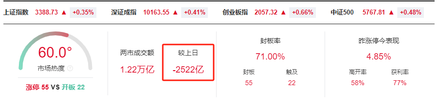 三大指数全天缩量反弹。截至收盘,沪指涨0.35%,深证成指涨0.41%,创业板指涨0.66%。两市个股涨多跌少,上涨个股超3500只;两市全天成交1.22万亿元,较上一日缩量成交2522亿元,内资主力资金净卖出20.94亿元;两市涨跌中位数为0.52%。