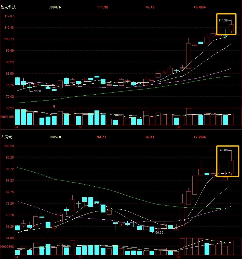 另一个比较强的方向就还是中报预期的标的了,今天CPO/达链相关的科技股又一次爆发,胜宏科技、太辰光等标的再创阶段新高。6月下旬陆续开始有公司会发半年报预告了,所以这个方向也是反复走强。