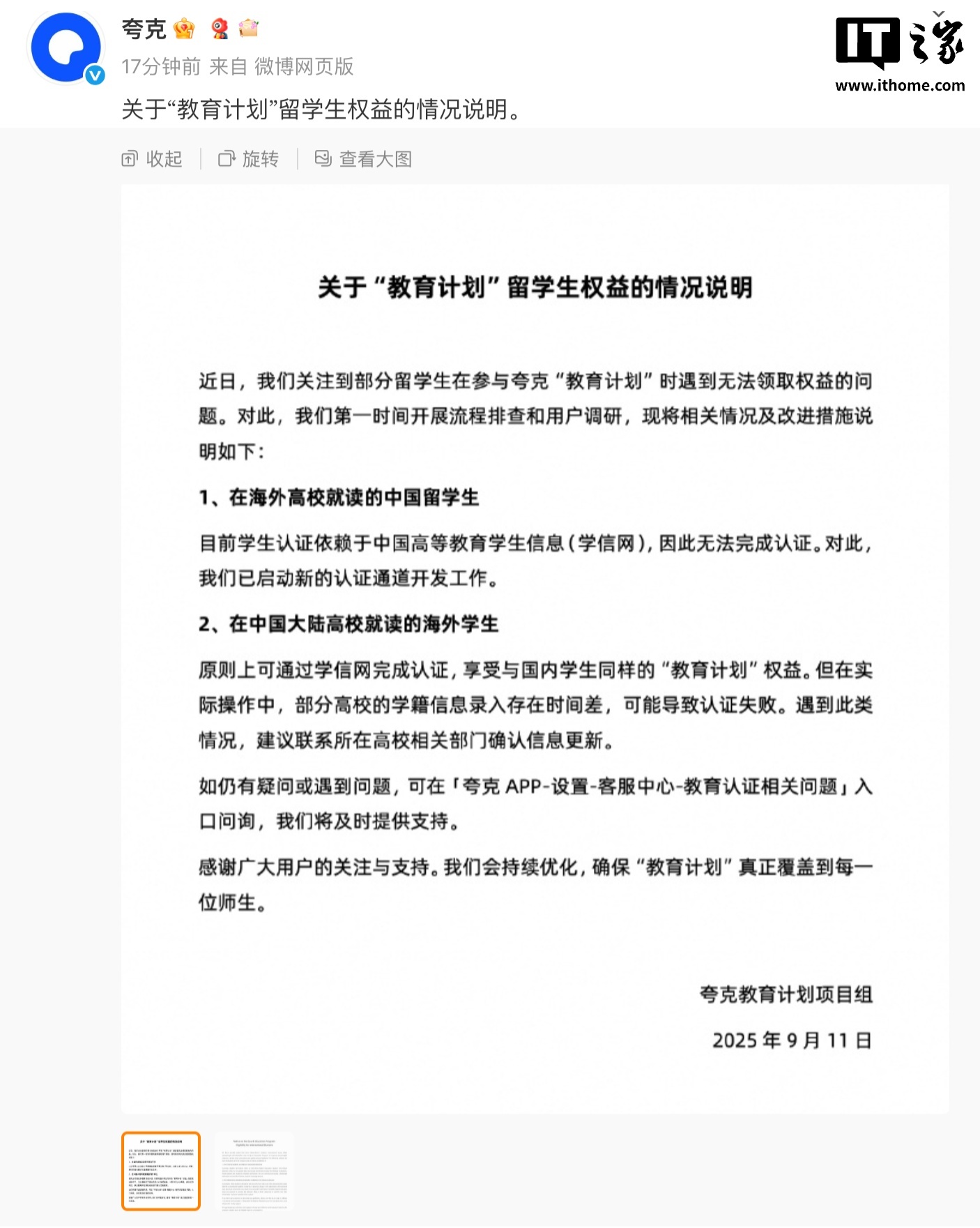然而,计划实施过程中同花顺e配,部分在华留学生反馈无法完成身份认证,导致无法领取相关权益。针对这一问题,夸克官方今日傍晚通过微博发布《关于“教育计划”留学生权益的情况说明》,详细回应了认证障碍及解决方案。